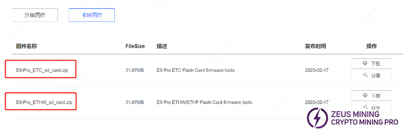 Software: decompression tool (WINRAR recommended), E9 Pro card flash firmware. There are two versions of E9 Pro card flash firmware, one is to mine ETC, and the other is to mine ETHW; please choose according to your immediate needs when downloading; we use ETC firmware as an example.