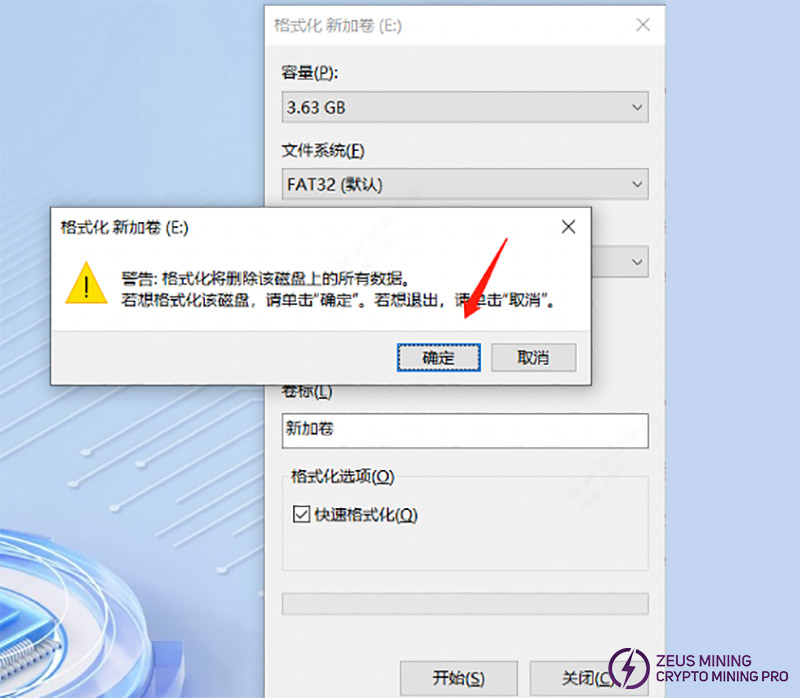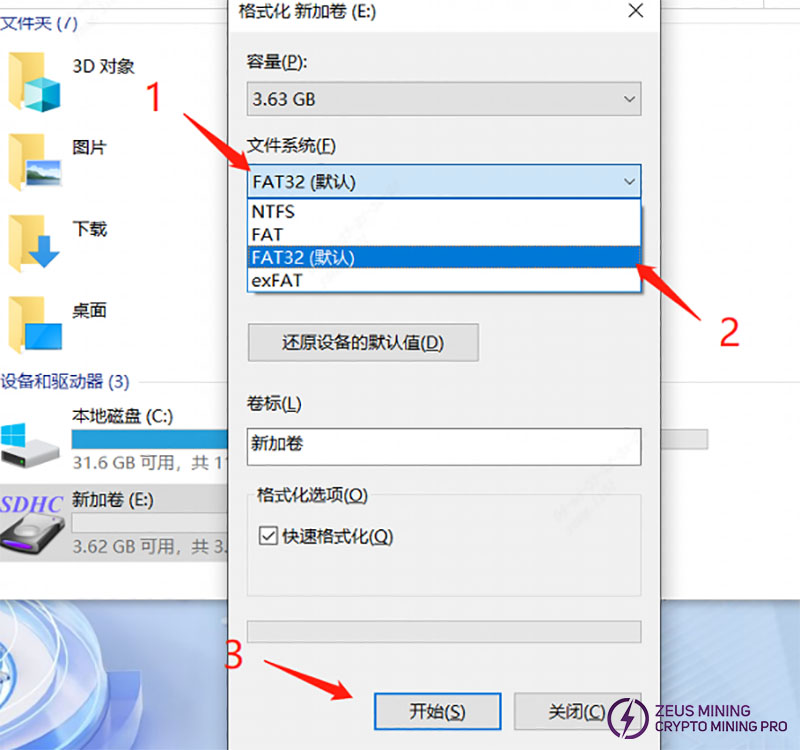 After you click Formatting, a new dialog box will pop up (as shown below). In the new dialog box, click the drop-down menu behind the file system and select FAT32 (the default is FAT32). Once you have selected it, click Start, and it is ready to be formatted.