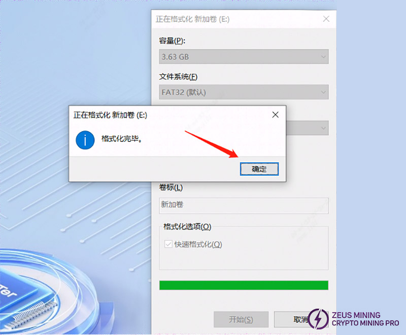 The formatting process is relatively simple; generally, after clicking confirm, there is no response for about 2 seconds; wait for a while (as shown below) the progress bar will go to the head. After it reaches the head, a dialog box will pop up, prompting that the formatting is finished, so click to confirm.