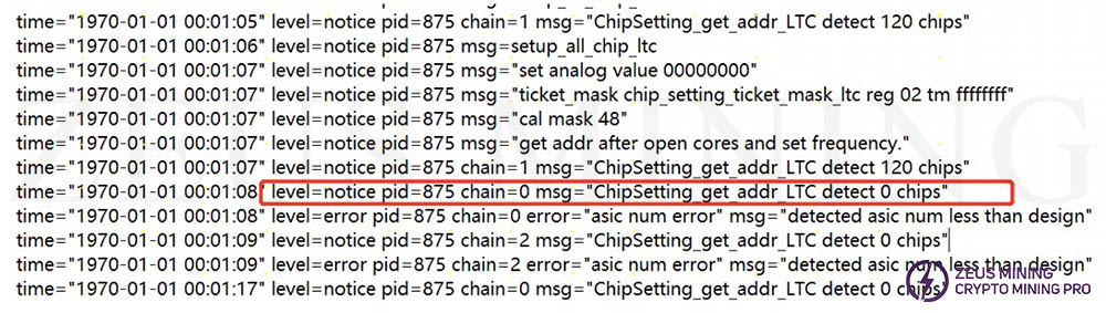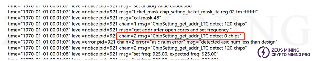 If the log returns: “chain=2 msg="ChipSetting_get_addr_LTC detect 0 chips”or“level=notice pid=875 chain=2 msg="ChipSetting_get_addr_LTC detect 0 chips"”