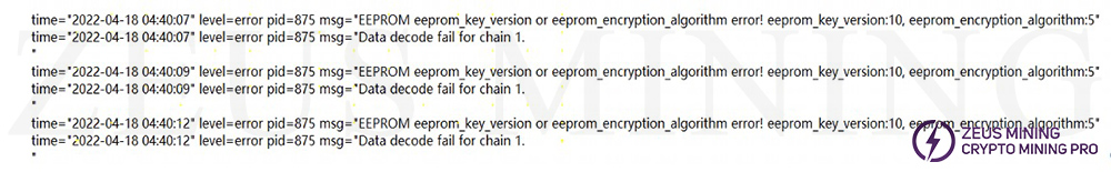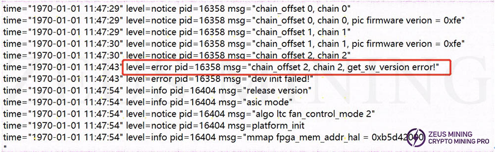 If the log returns: “level=error pid=23808 msg="chain_offset 1, chain 1, get_sw_version error!"