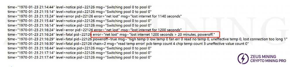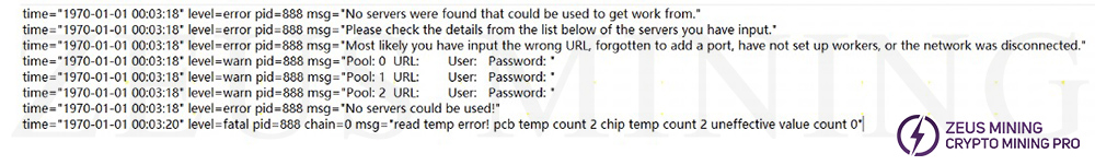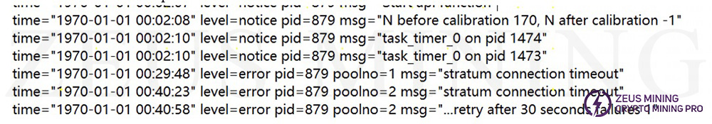 If the log returns:“ stratum connection timeout ”or“ level=error pid=879 poolno=2 msg="...retry after 30 seconds failures 1" ”