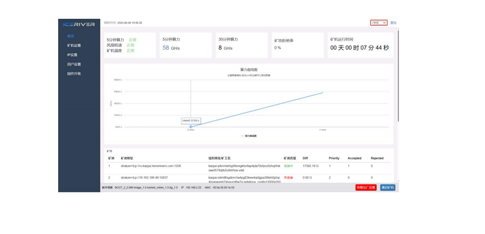 * After 5 minutes of connecting to the pool, you can view the machine's hashrate and hashrate chart, the chart is updated every 5 minutes.