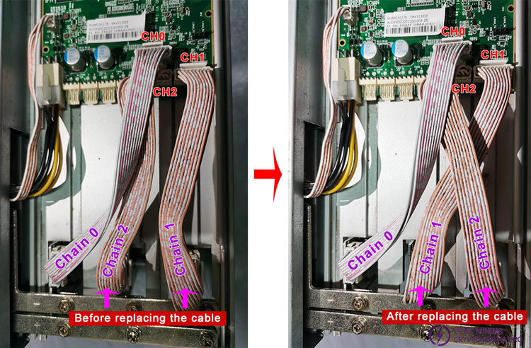 1. After the flat cable is exchanged as shown in the figure, if the kernel log still shows that Chain 1 detects 0 chips and Chain 2 can find 120 chips, it means that the flat cable connected to the CH1 interface is abnormal. We can replace this 18-pin data flat cable.