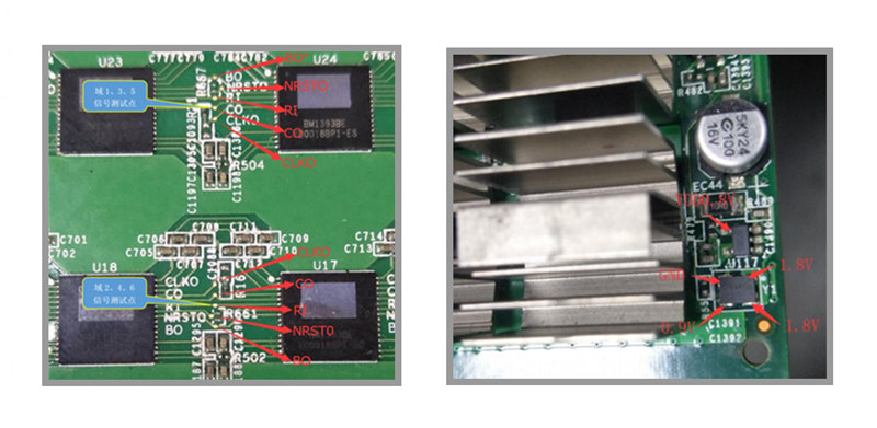The S9k and S9se hash board has a total of 6 voltage domains, and each voltage domain contains 10 chips. The hash table is equipped with 2 clock crystals and 2 temperature sensor chips