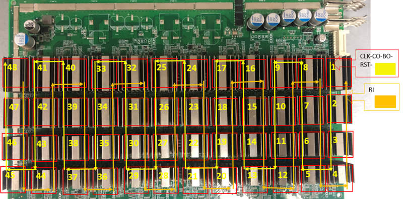 Antminer S17 single hash board uses a total of 48 hash chips, the model is "BM1397AD", and the signal direction is sequentially transmitted from U1 to U48.