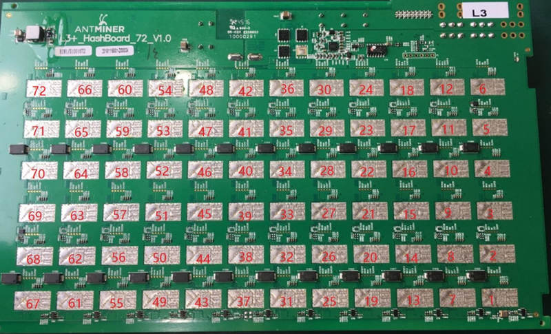 Antminer L3 + single hash board uses a total of 72 hash chips, the model is "BM1485", and the signal direction is sequentially transmitted from U1 to U72.
