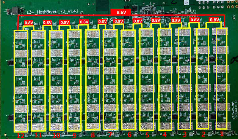 The L3+ single hash board has a total of 72 chips, divided into 12 voltage domains. Each voltage domain contains 6 chips. The voltage between the voltage domains is 0.80V. The voltage value of the first and last voltage domain is 9.6V