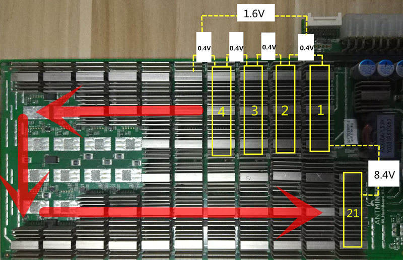 The S9 single hash board has a total of 63 chips, divided into 21 voltage domains. Each voltage domain contains 3 chips. The voltage between the voltage domains is 0.40V. The voltage value of the first and last voltage domain is 8.4V