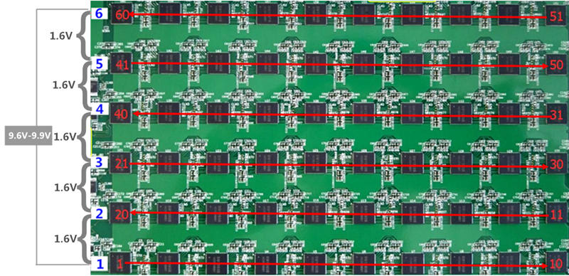 The S9k single hash board has a total of 60 chips, divided into 6 voltage domains. Each voltage domain contains 10 chips. The voltage between the voltage domains is 1.6V. The voltage value of the first and last voltage domain is 9.6V