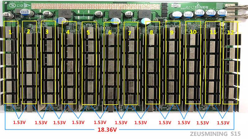 The S15 single hash board has a total of 72 chips, divided into 12 voltage domains. Each voltage domain contains 6 chips. The voltage between the voltage domains is 1.53V. The voltage value of the first and last voltage domain is 18.36V