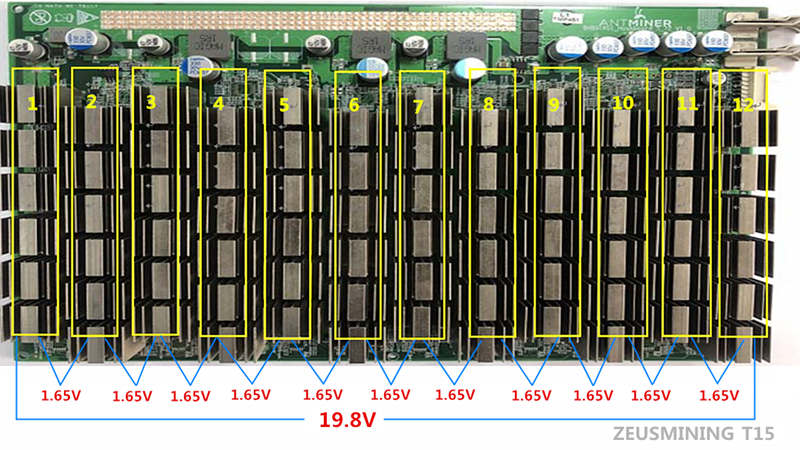 The T15 single hash board has a total of 72 chips, divided into 12 voltage domains. Each voltage domain contains 6 chips. The voltage between the voltage domains is 1.65V. The voltage value of the first and last voltage domain is 19.8V