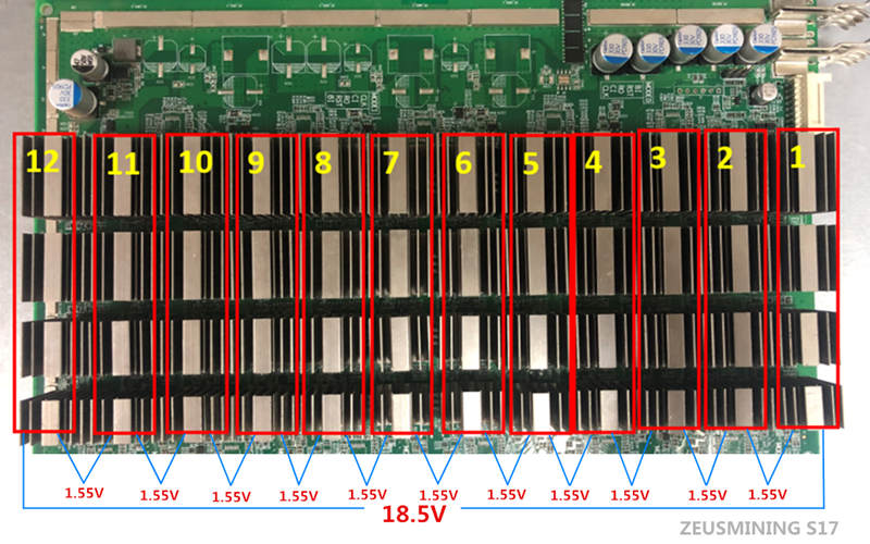 The S17 single hash board has a total of 48 chips, divided into 12 voltage domains. Each voltage domain contains 4 chips. The voltage between the voltage domains is 1.55V. The voltage value of the first and last voltage domain is 18.5V