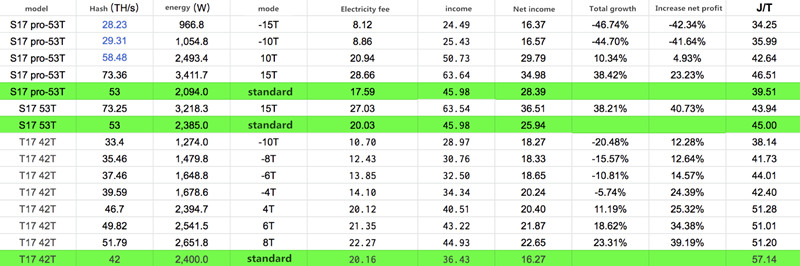 Example of s17pro 53T model: the standard is 68T after configuring overclocking mode + 15 gears, but the actual can reach more than 70T, and different machines will fluctuate slightly due to physical reasons