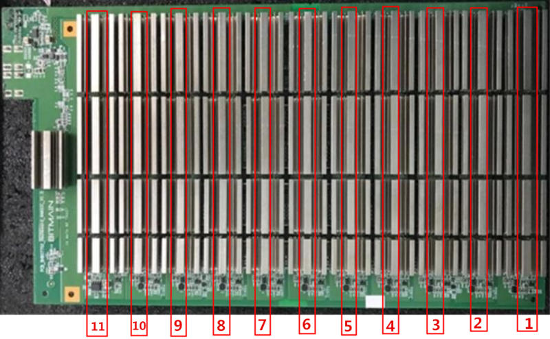 The whole board has 44 chips, divided into 11 voltage domains, and each voltage domain contains 10chips