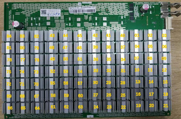 Antminer S11 single hash board uses a total of 84 hash chips, the model is "BM1387", and the signal direction is sequentially transmitted from U1 to U84.