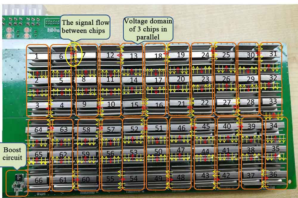 M1 is composed of 22 voltage domains in series, each voltage domain has 3 SMIT1700 chips in parallel, and there are 66 SMIT1700 chips on the whole board. Each voltage domain has an independent LDO to provide IO voltage and PLL voltage, the D05 version has an independent 24M clock circuit for each voltage domain, D06 is the clock provided by the previous chip, and each chip has an independent small heat sink on the front and back device, the front small heat sink (A) and the chip are fixed by a black glue with good thermosetting adhesive. The small heat sink (B) on the back is soldered to the chip's ground, so the heat sink B is charged and has voltage to the ground. Particular attention should be paid during maintenance to prevent short circuits.
