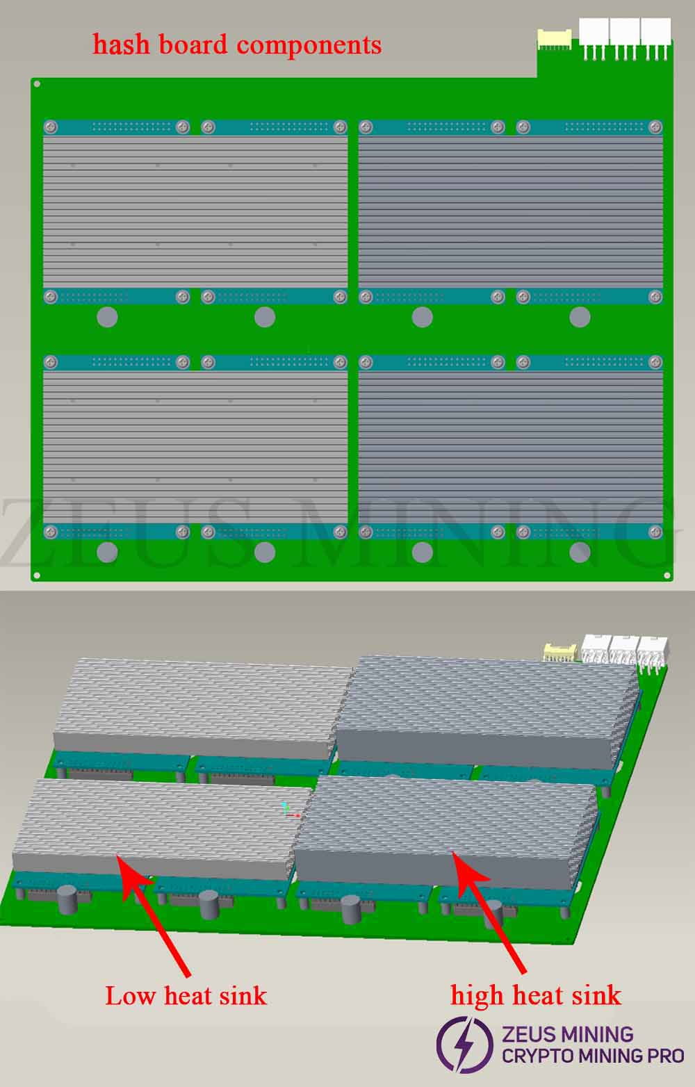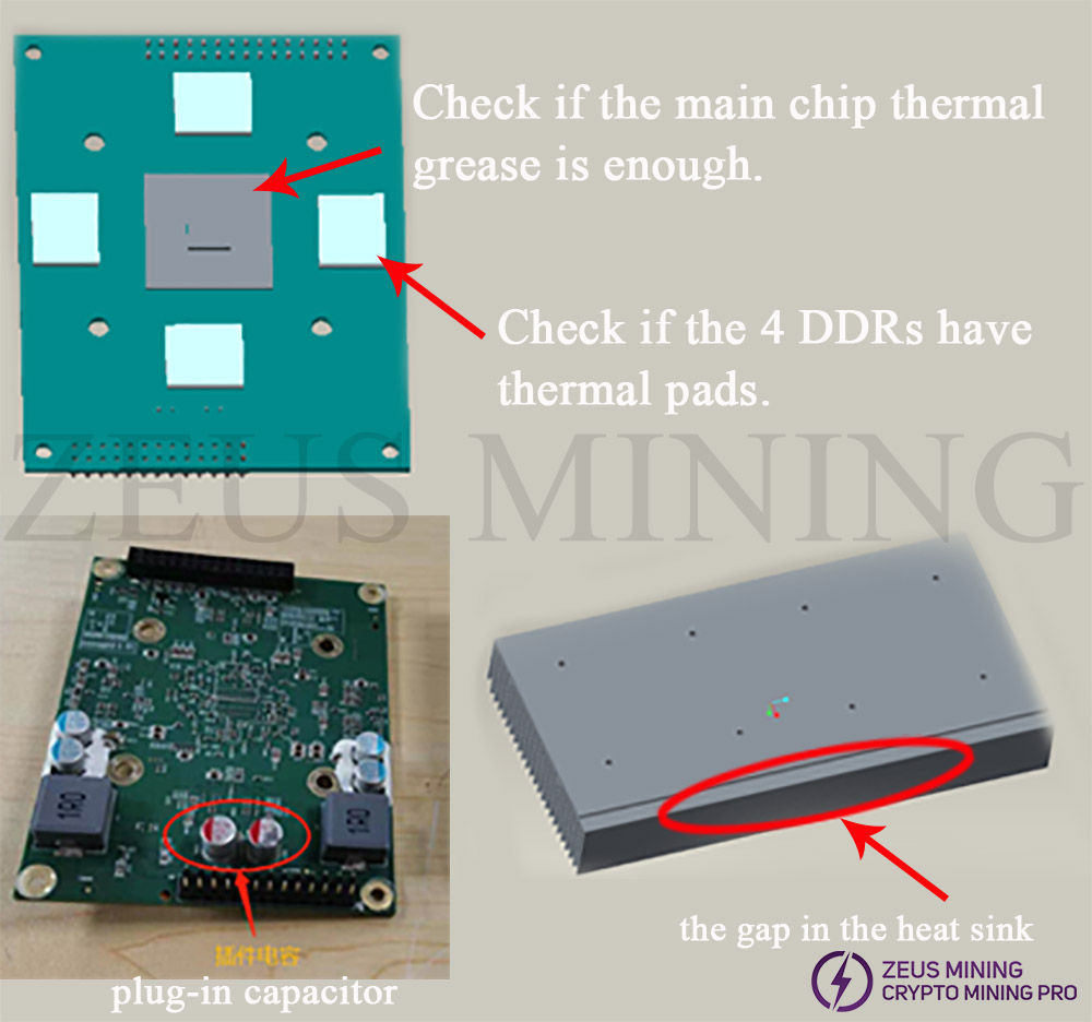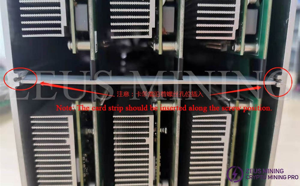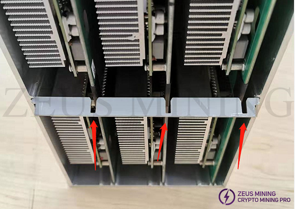 1. The installation and placement of the hash module are as shown in the figure: the two high plug-in capacitors need to be aligned with the gap of the heat sink, just above the gap, and then aligned with the screw holes after placement, and then lock the screws.