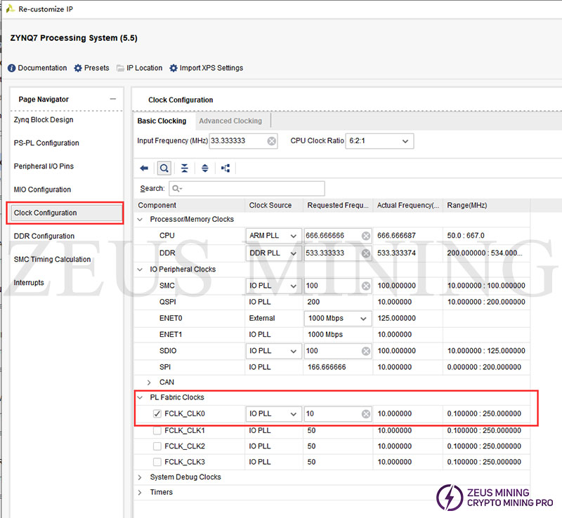 As shown in the figure above, because the crystal vibration of the FPGA side is selected, the clock used by the FPGA is led from the PS side. Therefore, you need to select FCLK_CLK0, and the output clock frequency can be set by yourself.