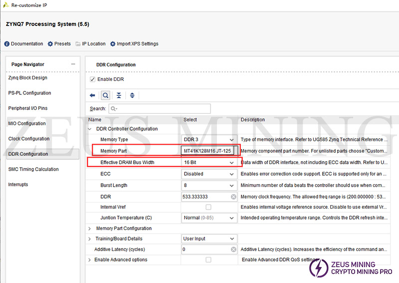 As shown in the figure above, the setting of DDR, MEMORY PART chooses MT41K128M16JT-125, and the data bits are selected as 16bit.