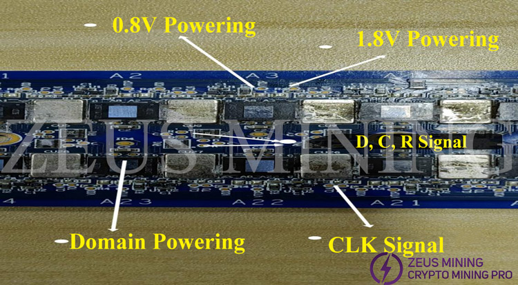 Second, test the main chip on the hash board if there is no problem with the voltage. The hash board of Avalon 921 is composed of 26 groups of domains connected in series, each group of domains is composed of a single chip, and each chip includes three powerings and four groups of signals. The three powerings are: Vcore, VTOP, and VDDIO, and the four sets of signals are: CLKin, Cin, Rin, Din and CLKout, Cout, Rout and Dout. As shown below: