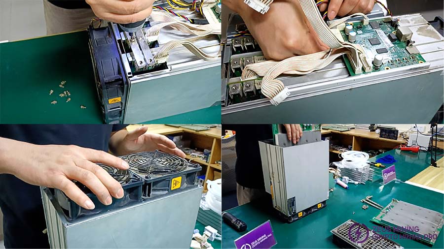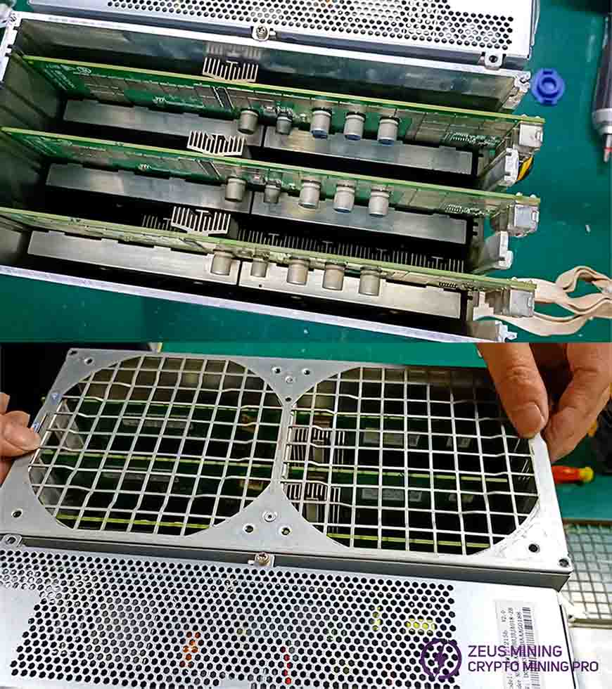 1. Use an electric screwdriver to remove the fixing screws of the hash board, the fan screws of the air inlet, and the outlet of the miner, and then unplug the cable to take out the hash board and the fan. The hash board can be cleaned with an antistatic brush if it is dusty.