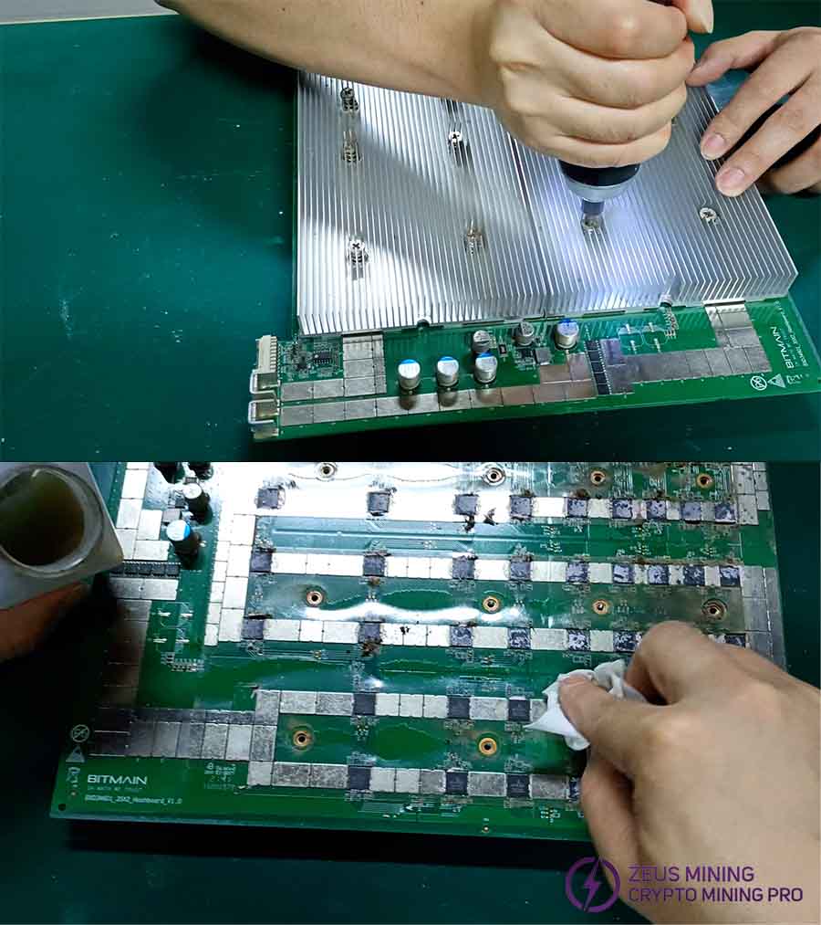 2. Remove the fixing nut of the heat sink, remove the original heat sink, and then clean the residual thermal grease on the surface of the ASIC chip with a hash board cleaning solution and dust removal cloth.