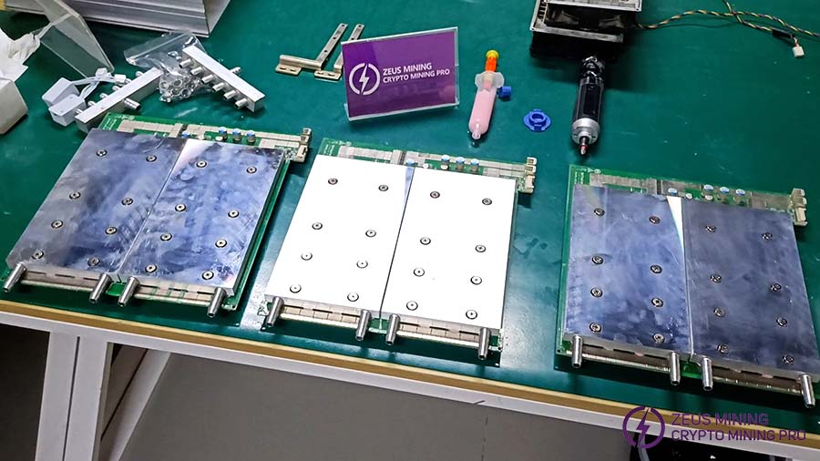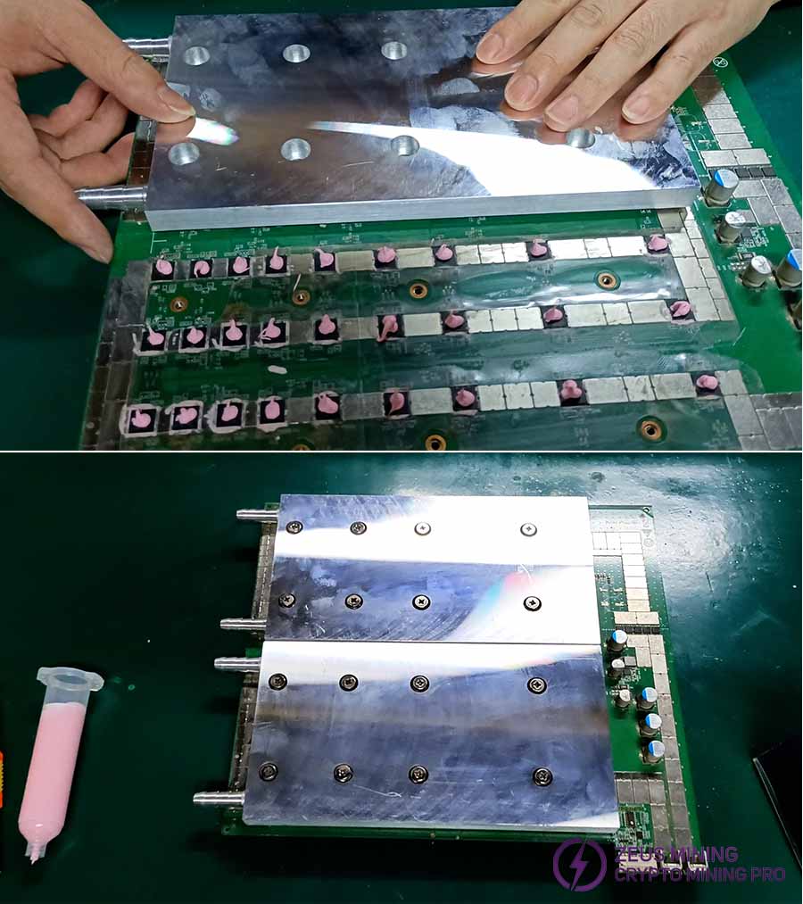 3. Re-apply thermal grease evenly on the surface of each ASIC chip, then install the water-cooled plate according to the corresponding hole position of the hash plate nut and fix it with nuts.