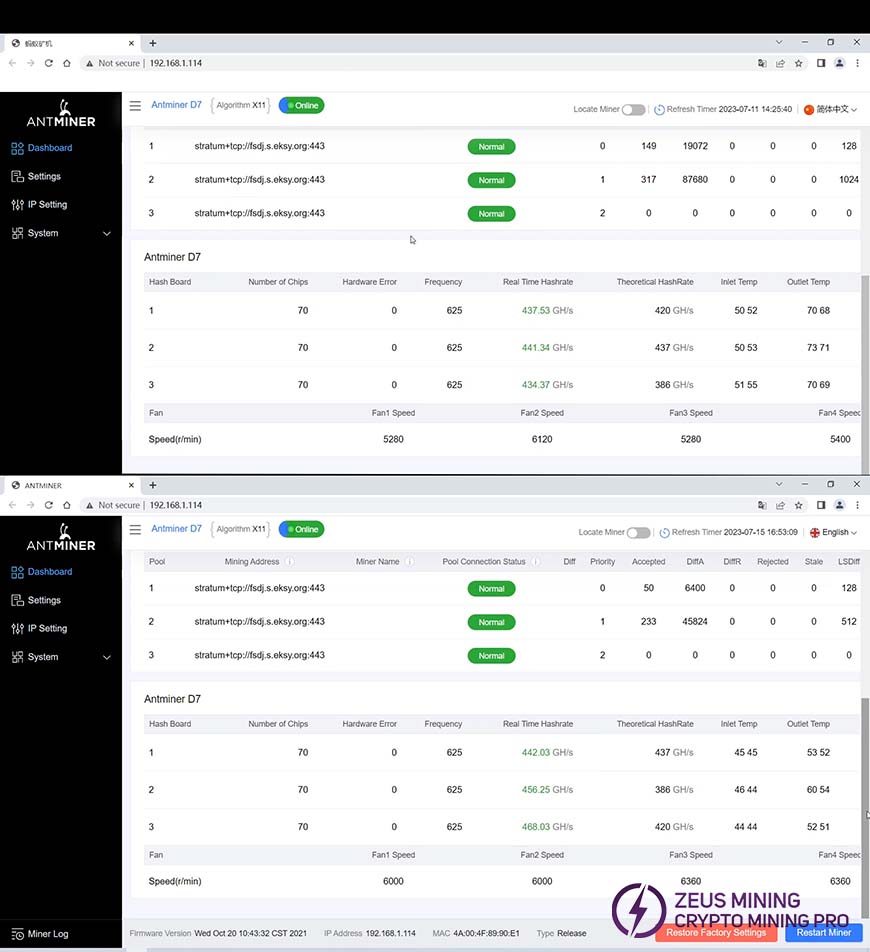 It can be seen that the hash rate is normal, the inlet and outlet temperature is about 10-15℃ lower than that of air cooling, the chip temperature is lower, and the fan speed is lower.