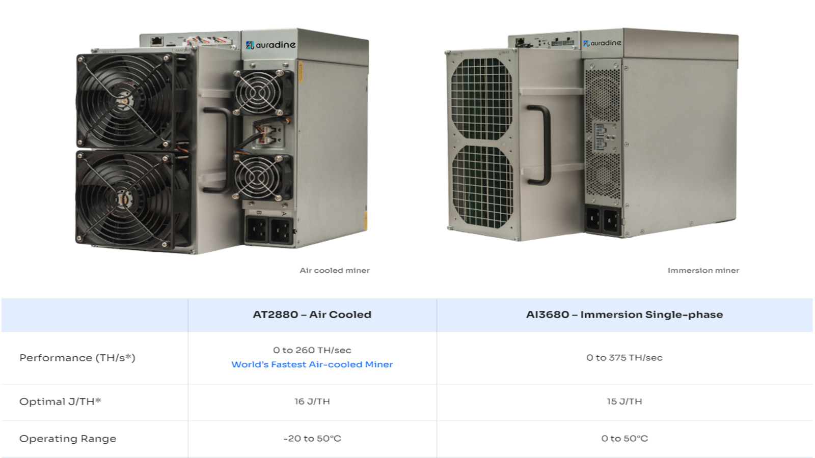 Auradine, a platform for network infrastructure solutions such as artificial intelligence and security, has announced the launch of its new generation Teraflux™ Bitcoin miners AT2880 and AI3680. The AT2880 air-cooled miner can achieve a performance output of 0 to 260 TH/s, with an optimal efficiency of 16J/TH and an operating temperature range of -20 to 50°C. The AI3680 immersion cooled miner is capable of achieving an output of 0 to 375TH/s with an optimal efficiency of 15J/TH and an operating temperature range of 0 to 50°C.