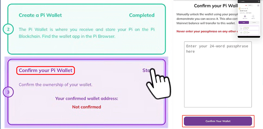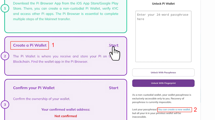 Click Start on the right side, then enter the Pi browser section, continue to scroll down and click “create a new wallet”, and then click “Generate new wallet”. Note that the wallet address is a passphrase. Please keep it safe. You can copy and save it in a secure place. You can also set your preferences here. It is recommended to choose the first option.