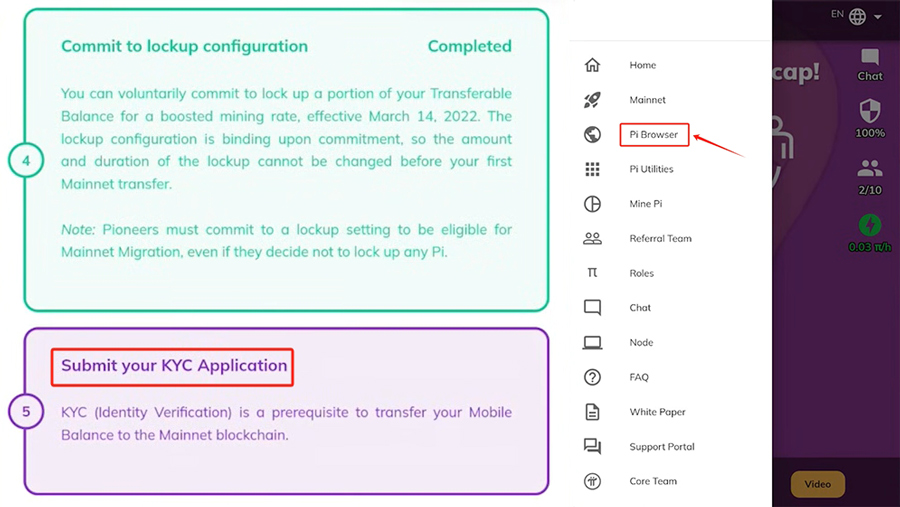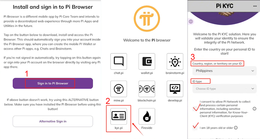 Return to the home page, click the three dashes in the upper left corner and select Pi Browser. Log in to the Pi Browser and click the icon kyc.pi.