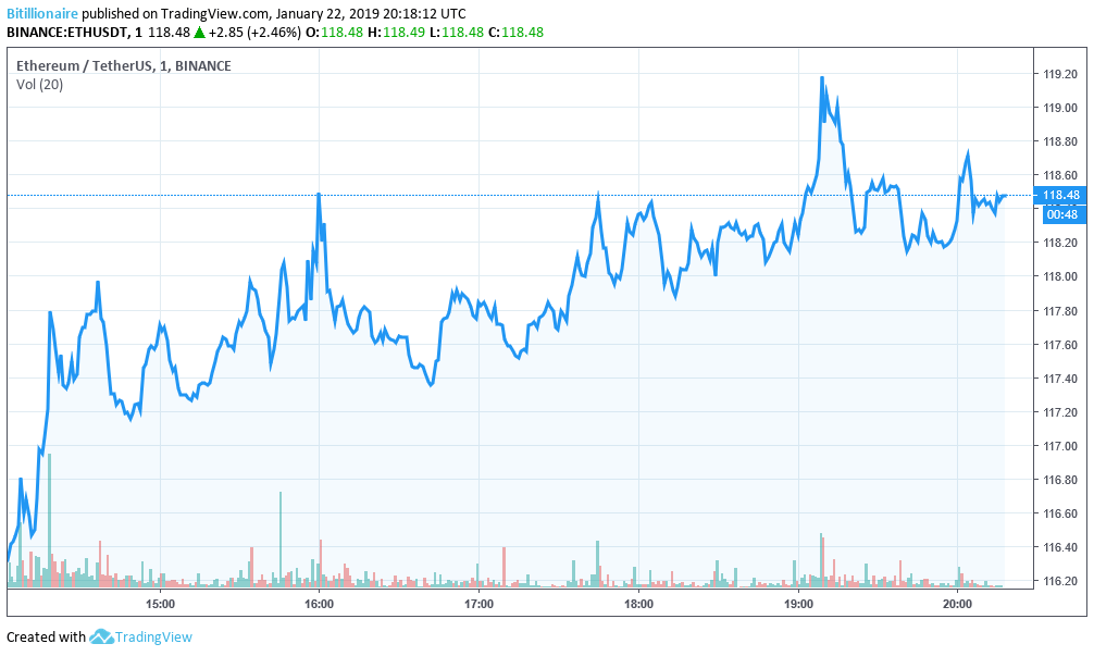 Ethereum has continued to lose momentum over the interim days, but today recovered over 1%. At press time, it stood at $118 on most markets. Binance and Bitfinex simultaneously had it over $120. The pressure seemed upward with almost double the percent gains of Bitcoin.