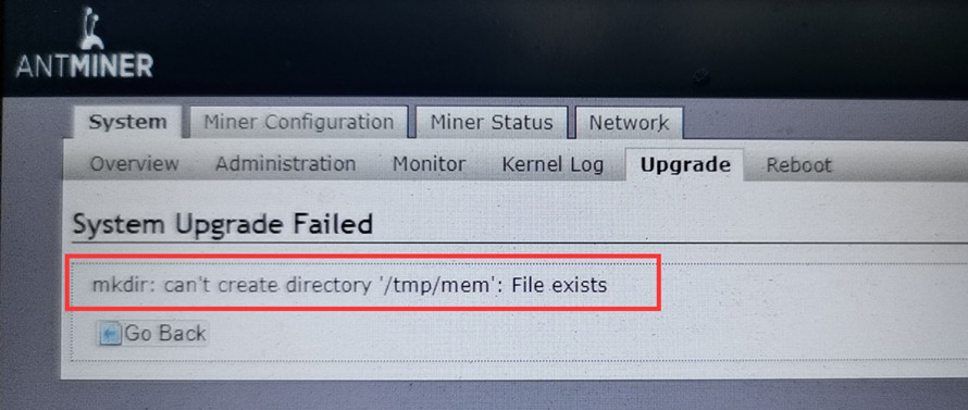 When upgrading a single miner through the web, please use our recommended browser: Google or Firefox. Upgrading with other browsers may cause problems. If the following problems occur during the upgrade process, please restart the miner before continuing.