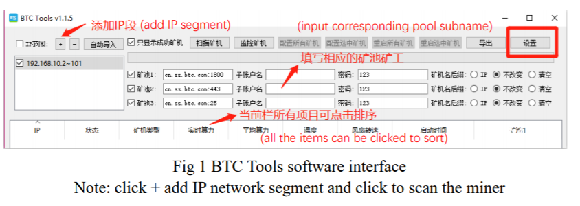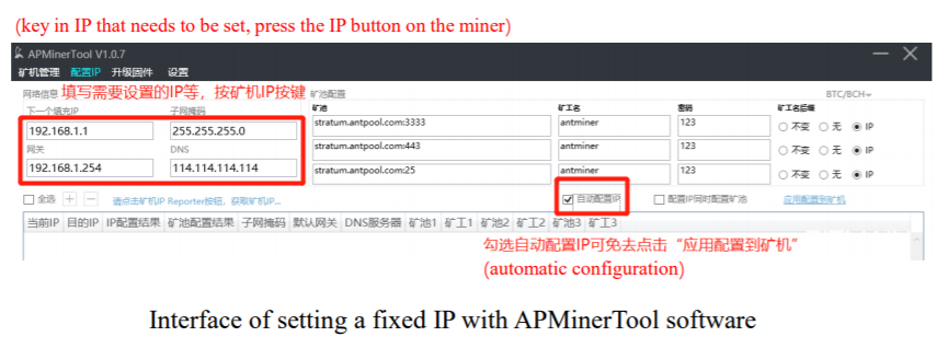 (4) After the new miner is on the shelves, use the batch software APMinerTool or BTC Tools to modify the mining pool miners, set a fixed IP as required, and confirm whether the miner's hashrate is average. When a single miner is put on the shelf, it is set to IP's original shelf position.