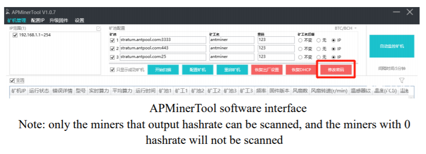 (2) Regularly check whether there are errors or omissions in the miner information of the miner in the mining pool. Except for the primary mining pool, the other two backup mining pools need to be filled in. It is recommended to change the miner's default root password and not download unofficial firmware and overclocking firmware upgrades to avoid illegally tampering with the mining pool miners by malicious firmware. APMinerTool software can be used to modify passwords in batches, and the software can also scan and manage miners.