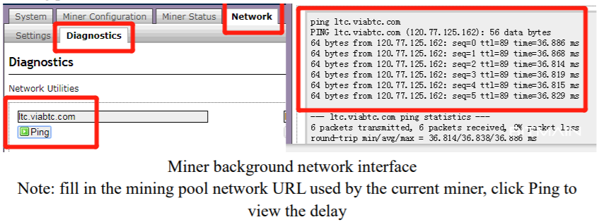 (2) Regularly Ping whether the delay of the mining pool used by the current miner is stable. If the delay is more than 100ms, you need to check the internal and external networks. The network manager will check whether the network equipment is faulty on the local area network. The broadband operator needs to check the equipment line for the external network. The delay is too high Will cause fluctuations in hashrate. The Ping function option is located in Network-Diagnostics. The current mining pool address cannot be pinged when checking the network with 0 hashrate. It is a network failure.