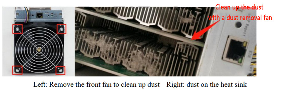 (2) Regularly check the dust condition of the miner every month. You can unpack the front fan of the miner to view. If a large amount of dust, catkins, etc., are found to block the air duct at the position of the heat sink, the high-temperature protection needs to be cleaned up in time. Use a dust-removing fan to blow off the dust. Be careful not to use a brush that is too hard or uses too much force. Otherwise, it will easily cause the heat sink to fall off. After the brush is processed, use the dust remove fan to blow away the dust. (Note that when removing the fan, you only need to remove the four screws on the fan, not the screws with tamper-evident labels on the fuselage).