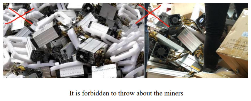 (3) When handling the miner, handle it gently. It is forbidden to carry the hash board cable or power cord directly, and it is forbidden to throw it away from a high place. Workers must inform the miners not to throw them away when they are transporting them. Otherwise, the heat sinks and chips on the internal hash board of the miners may fall, or the fans that hit the outside may be damaged or even scrapped.