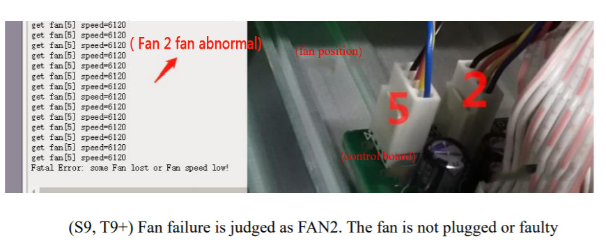 (1) Reconfirm whether the miner failure can be restored to normal at the site before taking off the shelf. Generally, the site can solve the problems such as high temperature protection, fan failure, network failure, and system failure (the mine farm can purchase some fans as spares). Minimize the misjudgment of the fault and return to the regular after-sales miner. Fan failure judgment can be viewed from the Kernel log in the background of the miner. FAN2 and FAN5 in S9 and T9+ series fan logs belong to the corresponding relationship.