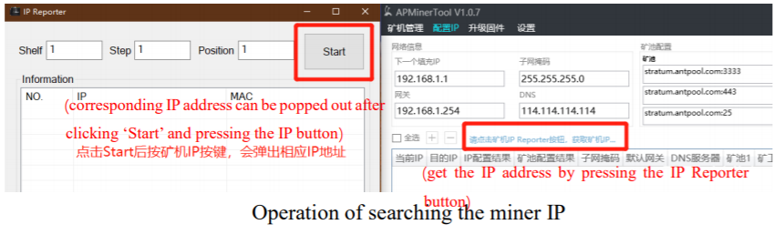 (2) Confirm whether the IP corresponds to the actual product to avoid mistakes. Suppose you are not sure about the IP of the miner. In that case, you can find the IP Reporter software IP Reporter directly click Start and then press the miner IP button or click the "Configure IP" option on the APMinerTool software and then press the miner IP button to confirm.