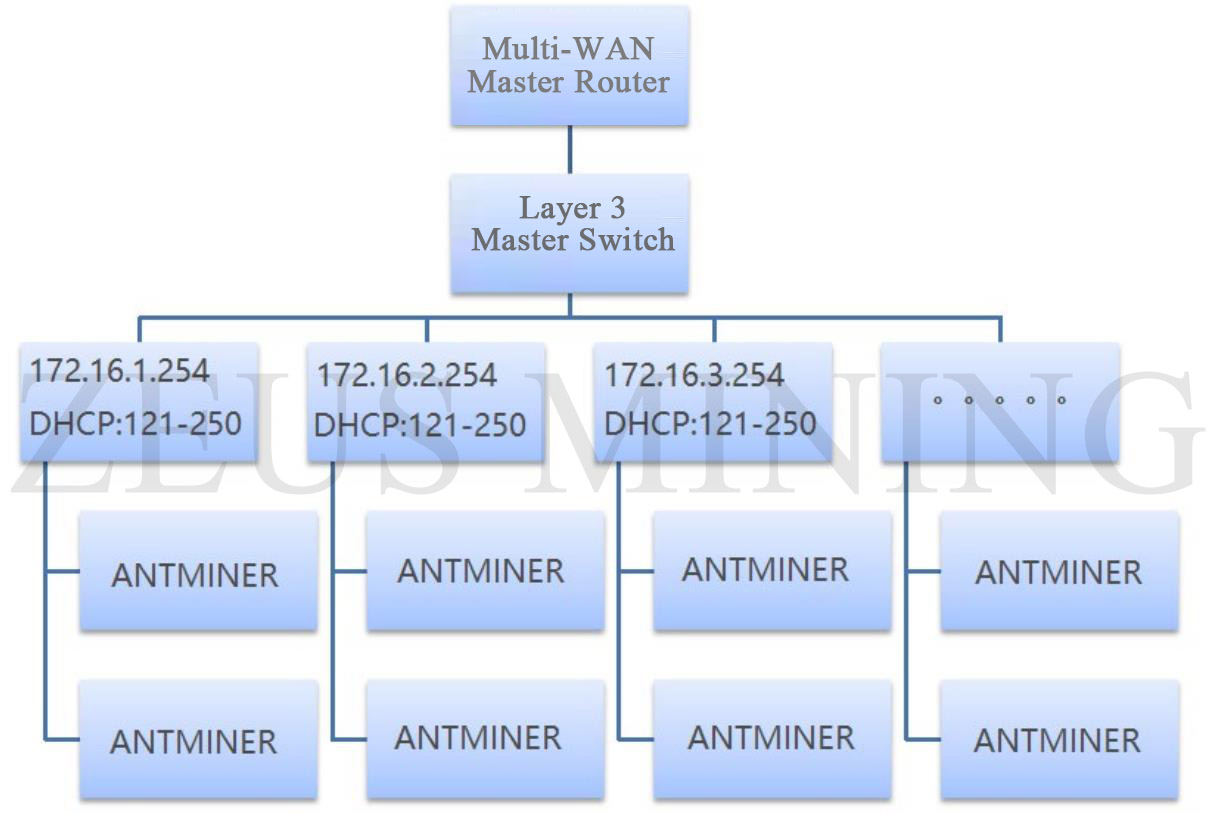 When a new site is constructed, planning the network topology can reduce unnecessary workload in the later stage. For example, the mining farm has 20 shelves, each shelf has 12 layers, each layer has 10 miners, and each shelf has a total of 120 miners.
