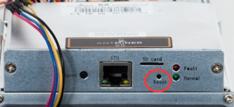 After the miner is turned on for 2 minutes, please press and hold the "Reset" button for 5 seconds, and then release it. The miner will restore the factory settings within 4 minutes and restart automatically (no need to shut down the miner).