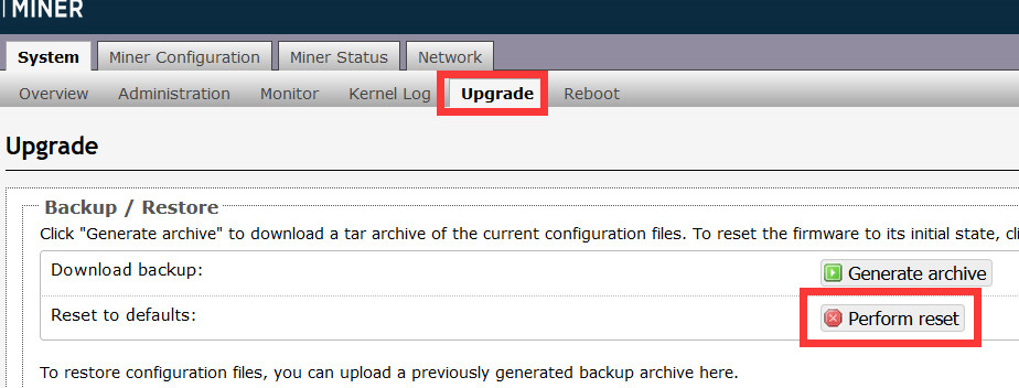 Log in to your miner interface, click Upgrade> Perform Reset, and click "OK" in the pop-up window.