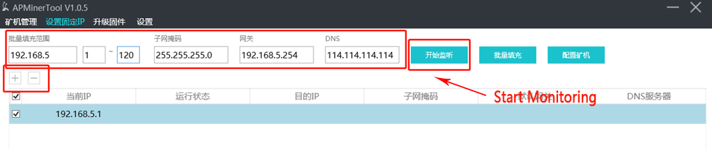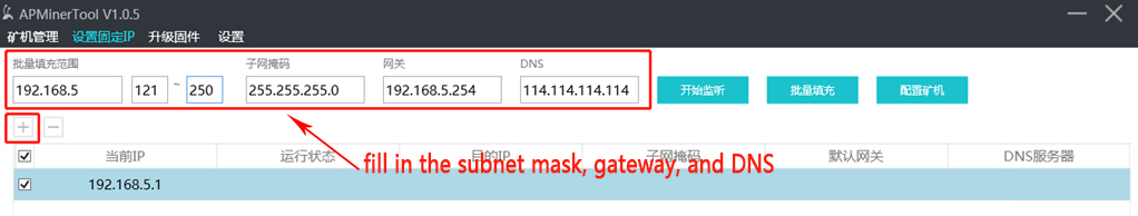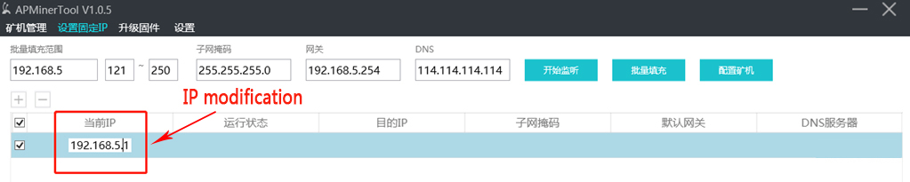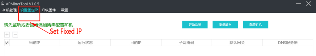 (1) Open the APMinerTool 1.05 software, and click the "Set Fixed IP" option at the top left of the software.