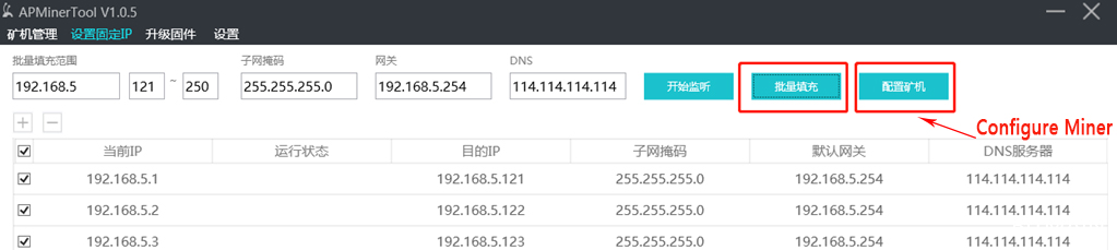 (12) Click "Configure Miner" at the top right of the software to fix the IP of the miner to 1-120 in order.