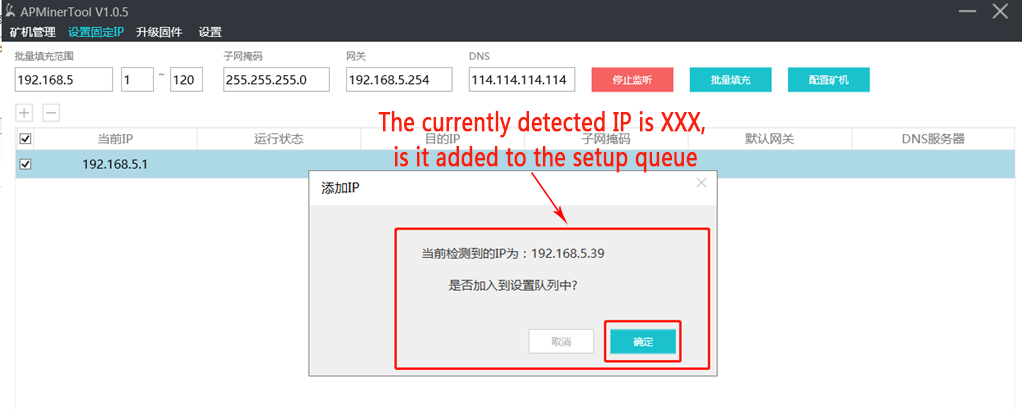 (8) Press the IP button from the No. 1 miner on the shelf, and then the software will pop up "The currently detected IP is XXX, is it added to the setup queue" and click "OK" to add the machine to the setup queue.