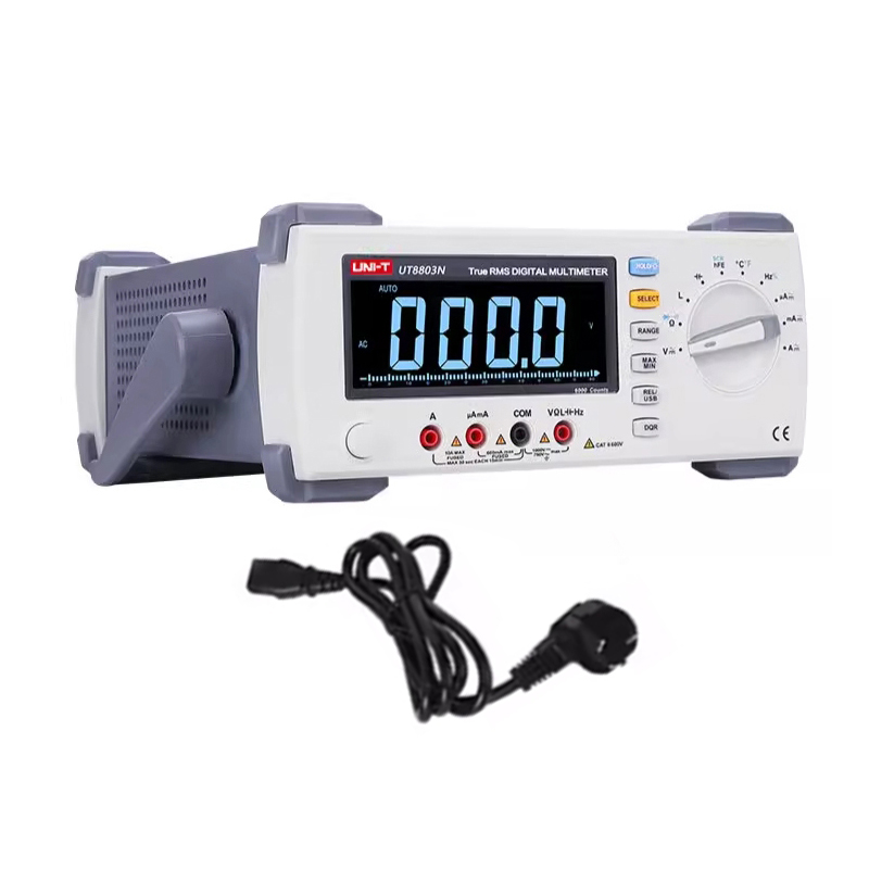 UT8803N benchtop digital multimeter is a 5999 count, 3 5/6 digit auto-range true RMS benchtop digital multimeter. It has a large screen with a backlight, an extraordinarily large character display, full function, complete range overload protection, and a unique design, making it an excellent electrical measuring instrument. This meter can measure AC and DC voltage, AC and DC, resistance, frequency, capacitance, inductance, transistor hFE, diode (LED), thyristor (SCR), and buzzer circuits on and off. It is an essential experimental tool for major miners to repair.