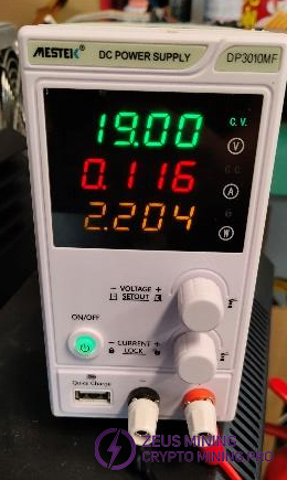 3. The hash board part runs normally, and the adjustable PSU shows 19V@3A, which means that the network connection is successful and the hash board is running normally.