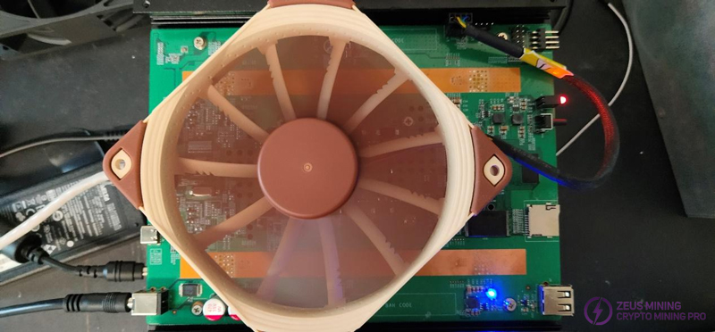 5. KS0 miner at the beginning of power on, after the hash board runs normally, the fan does not rotate. Only when the chip temperature is higher than 65℃ does the fan rotate (a larger fan is replaced as a demonstration for the convenience of the display).